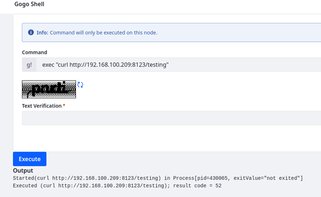Every time a command is submitted, the user must solve the CAPTCHA and enter the correct value in the text verification field. If the CAPTCHA is not entered correctly, then the Gogo shell will not execute the command.