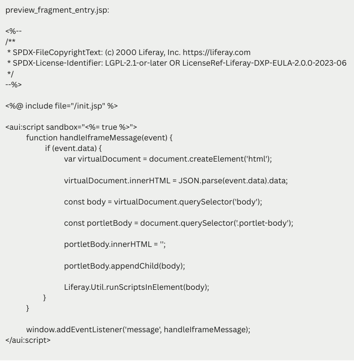As shown above, the JavaScript returned by this page registers the function handleIframeMessage as a handler for the message event. The handleIframeMessage function uses the data contained within the received message to set the value of the HTML inside the portlet-body element.